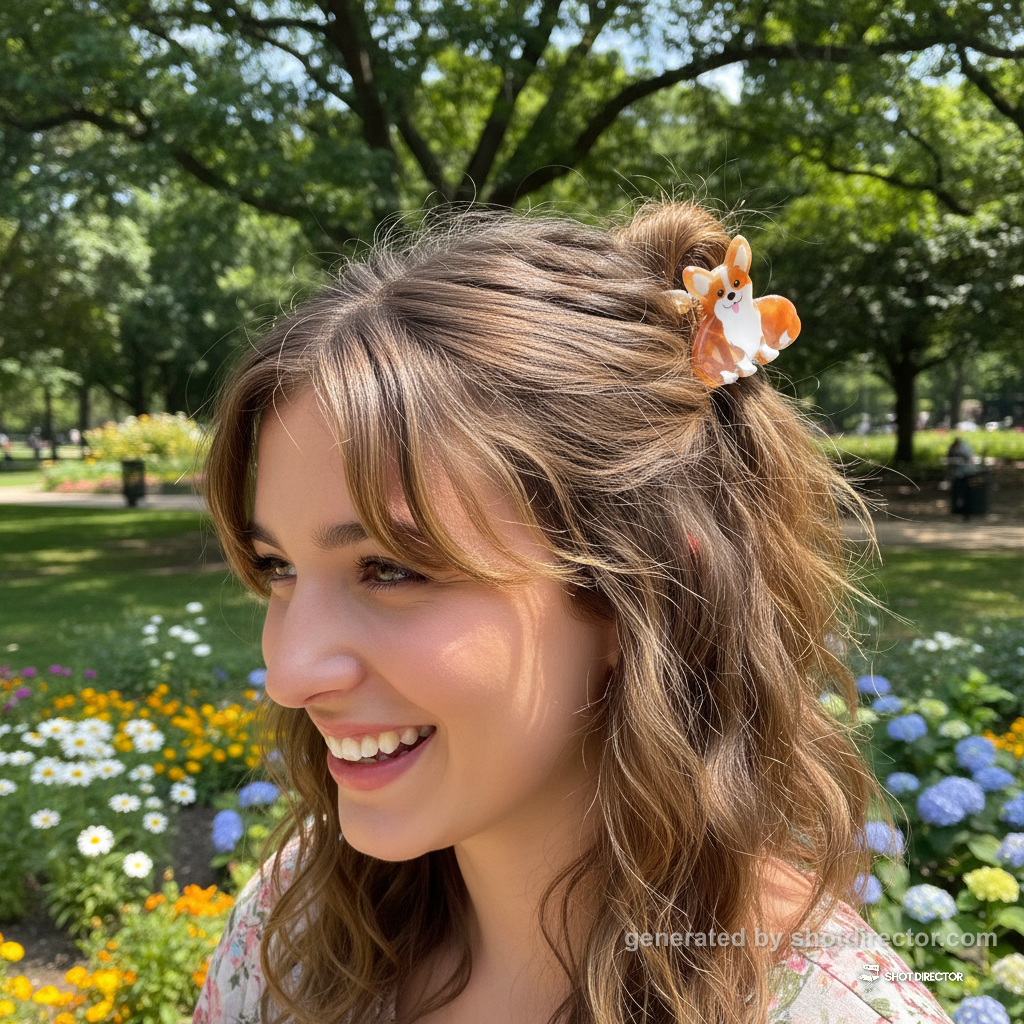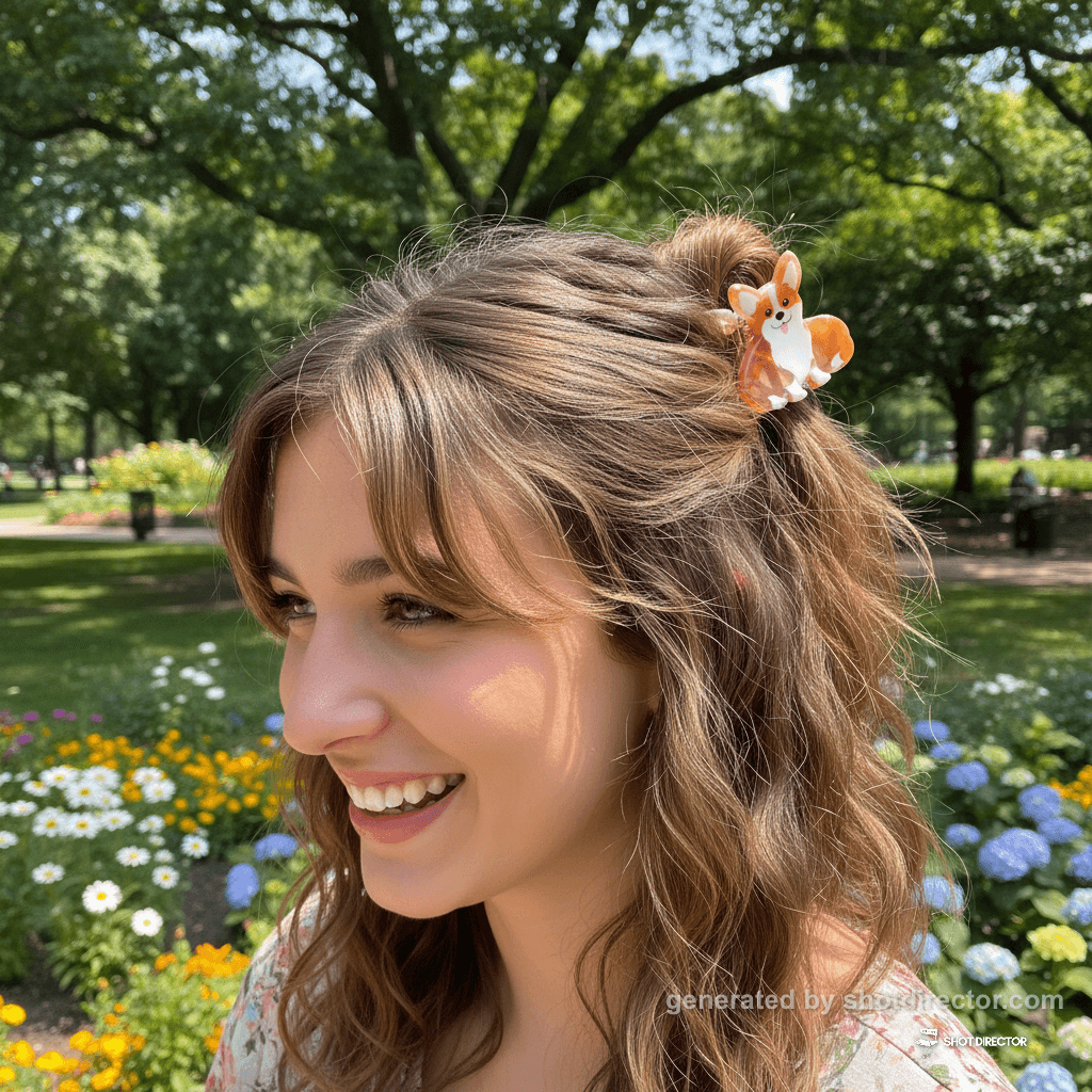 “A lively lifestyle shot of a smiling model wearing the Corgi hair claws in a chic half-up hairstyle, captured outdoors in a brightly lit park, emphasizing joy and the product's charming detail.”