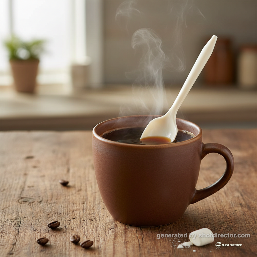 “A single Pami plastic spoon stirring a steaming cup of coffee or hot chocolate on a rustic wooden table, illuminated by soft morning light.”