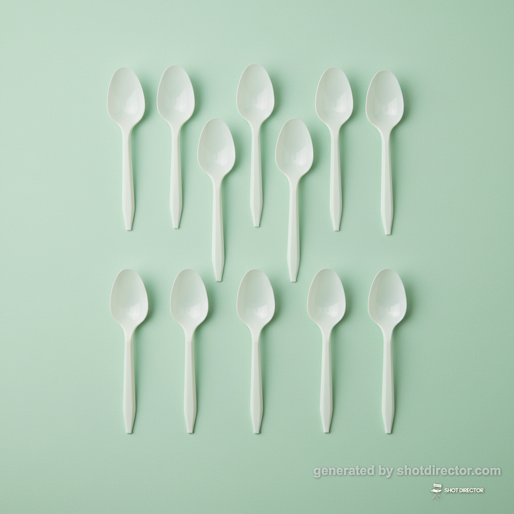“A minimalist overhead shot of several Pami plastic teaspoons arranged in a clean, geometric pattern on a pastel-colored background, with bright, diffused light.”