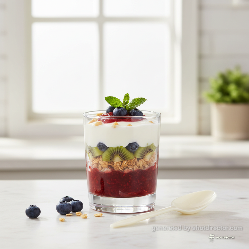 “A Pami plastic spoon artfully presented with a small, vibrant serving of a fruit parfait or a colorful dessert, on a light marble surface with soft, natural window light.”