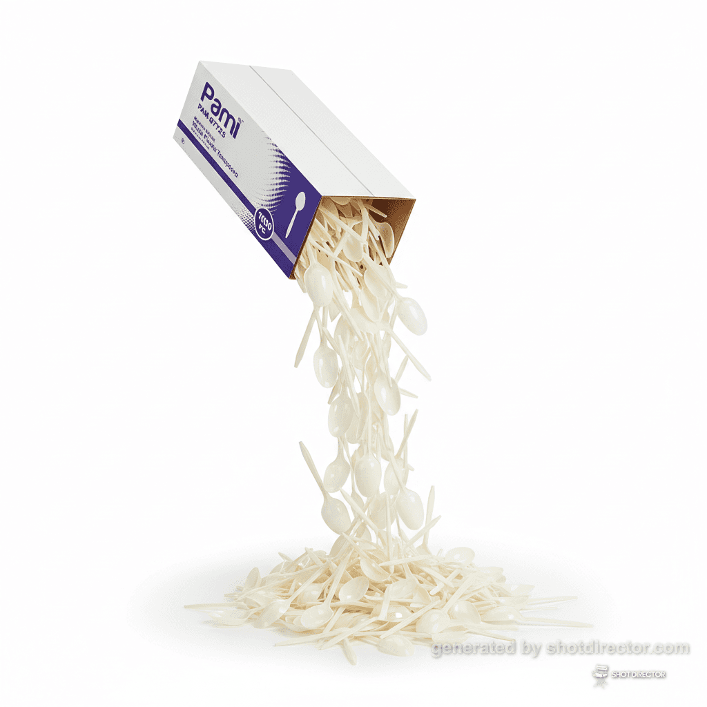 “A cascade of white plastic teaspoons pouring out of the Pami box onto a pristine white surface, captured with bright, even studio lighting.”