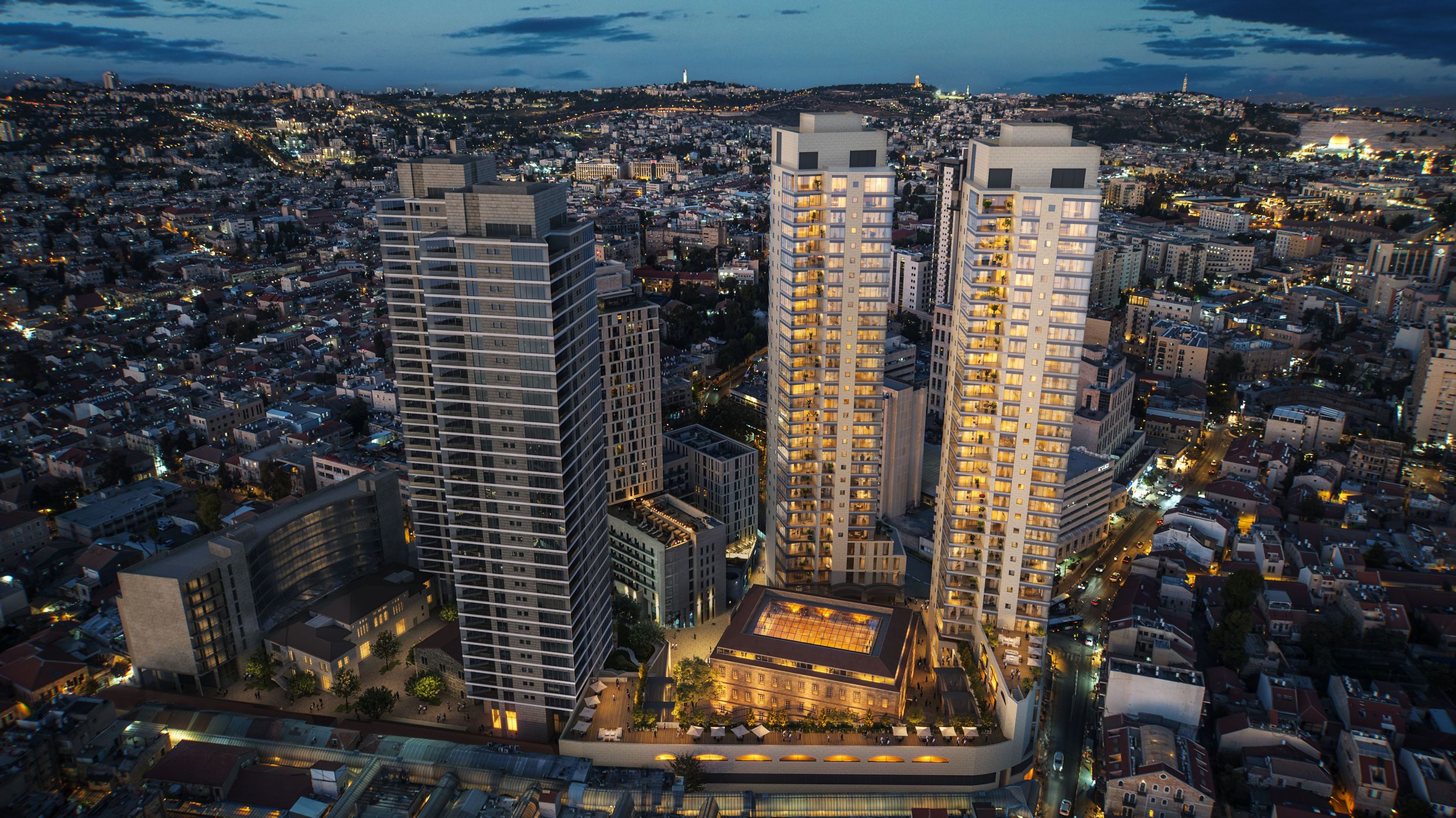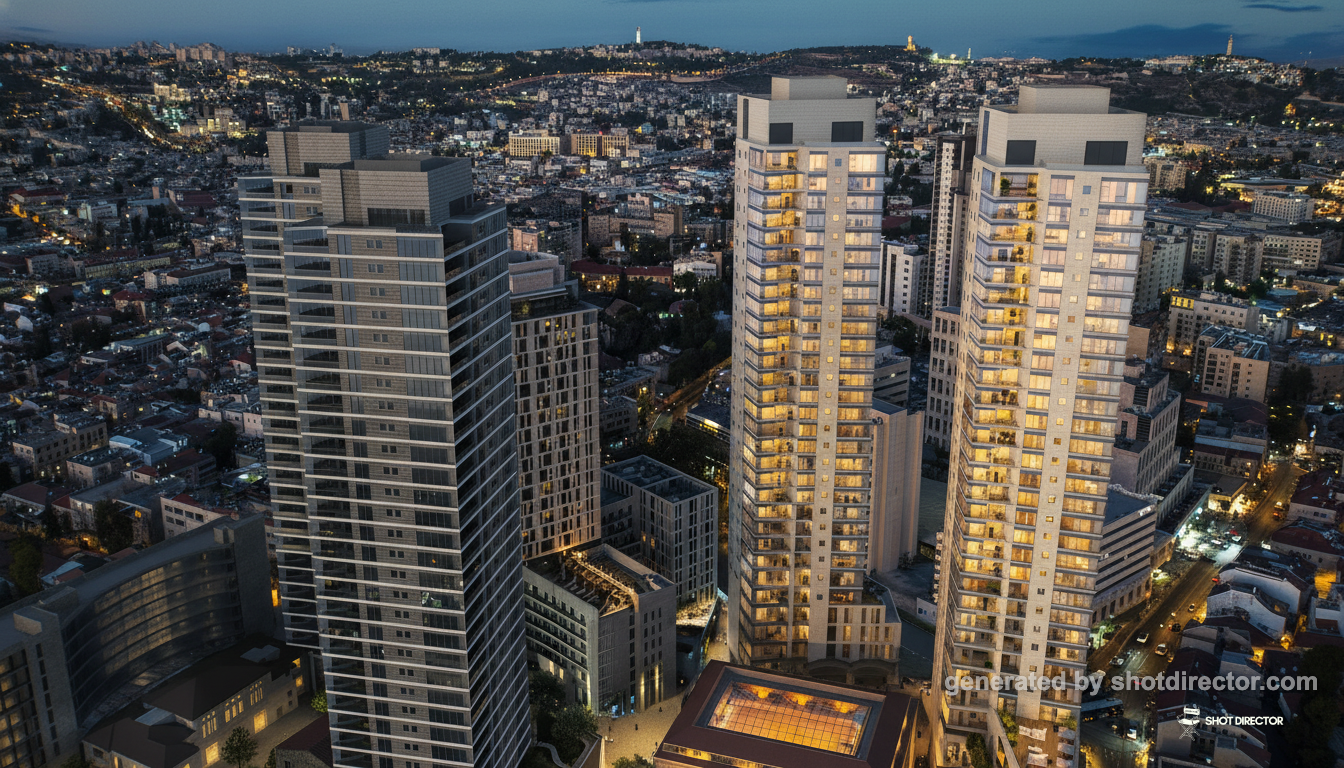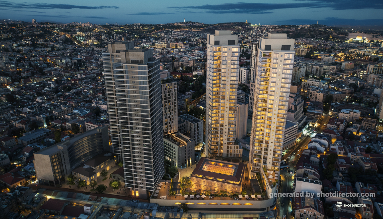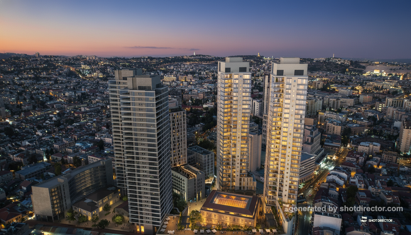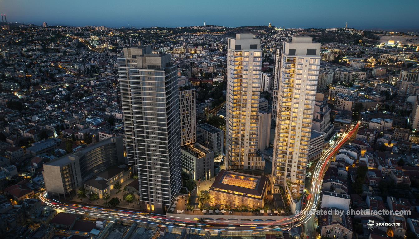 “An elevated shot capturing the two prominently illuminated towers at dusk, with the city lights of Jerusalem creating a soft, glittering bokeh background.”