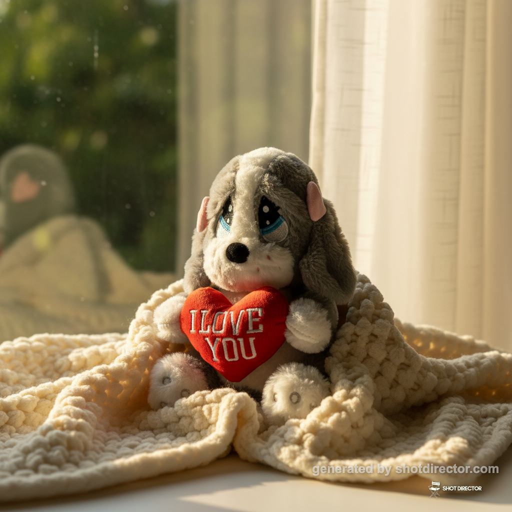 “A close-up shot of the plush puppy nestled in a cozy blanket by a sunlit window, with soft, warm light highlighting its expressive eyes and the 'I LOVE YOU' heart.”