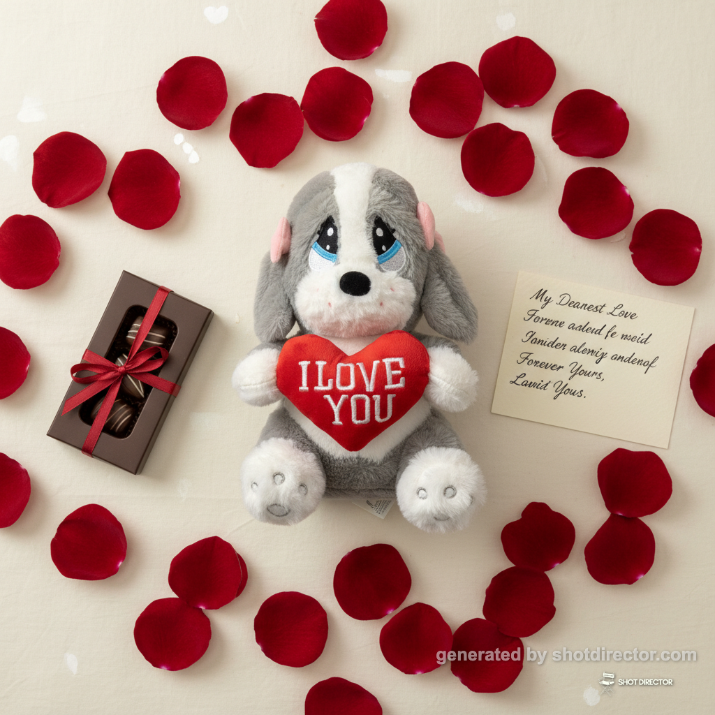 “A romantic flat lay composition with the plush puppy at the center, surrounded by rose petals, a small box of chocolates, and a handwritten love note, lit by soft, diffused light.”