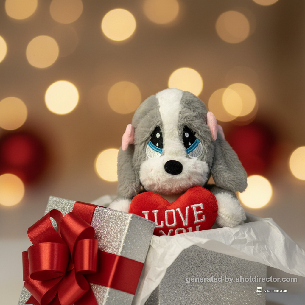 “The plush puppy peeking out from inside a beautifully wrapped gift box, with only its head and the heart visible, using bokeh lighting to create a sense of surprise and anticipation.”
