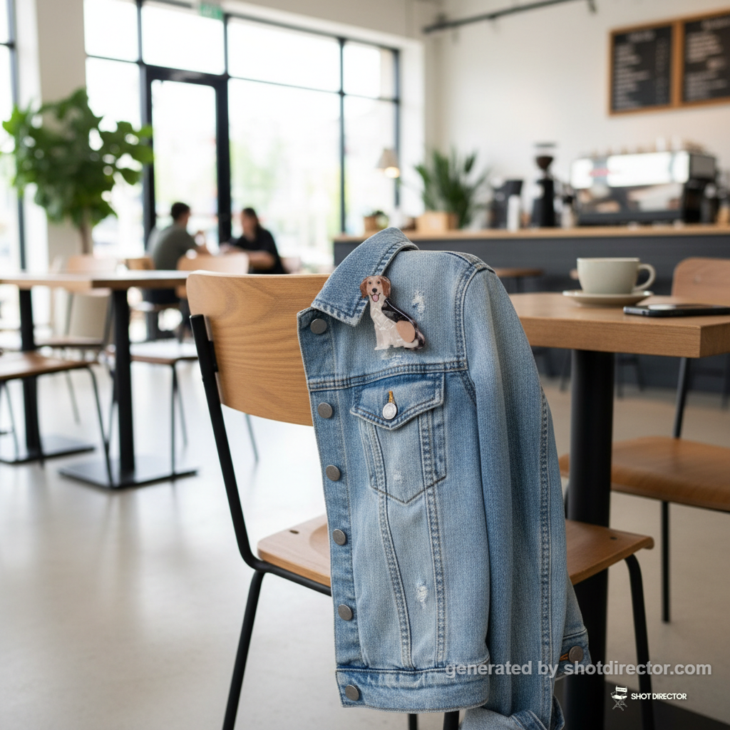 “The dog hair clip clipped onto the collar of a trendy denim jacket, draped over a chair in a brightly lit, modern cafe setting, conveying a fun and youthful accessory.”