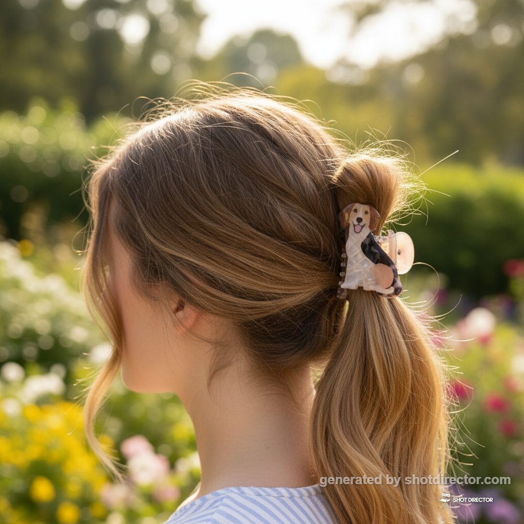 “The dog hair clip adorning a casually styled ponytail on a model with a vibrant, out-of-focus outdoor background, capturing a lively and cute everyday look under natural light.”