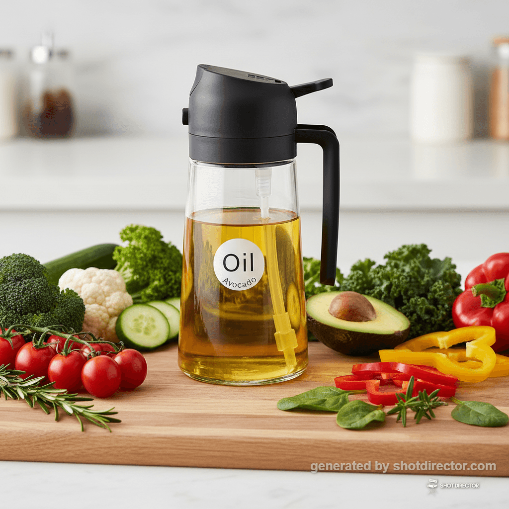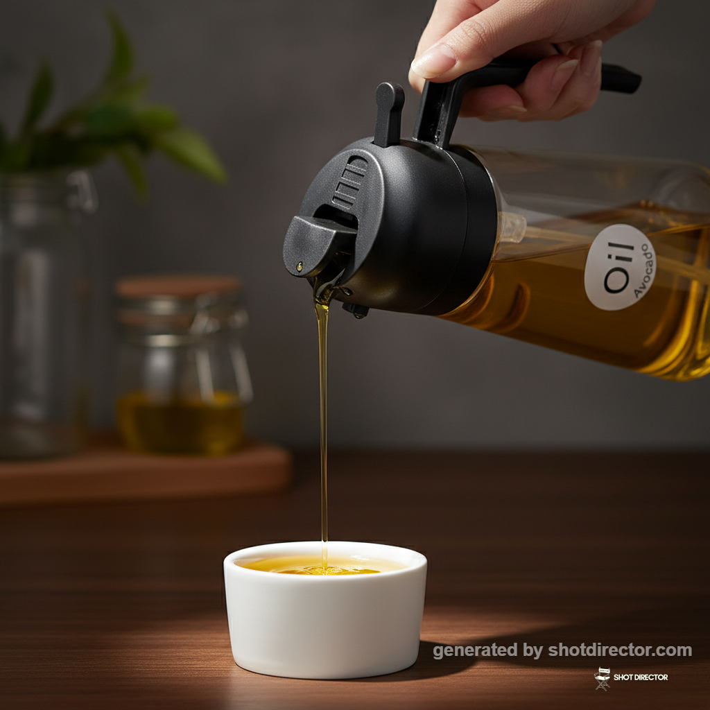 The shot will elegantly emphasize the innovative dual functionality, allowing users to easily switch between pouring and spraying oil