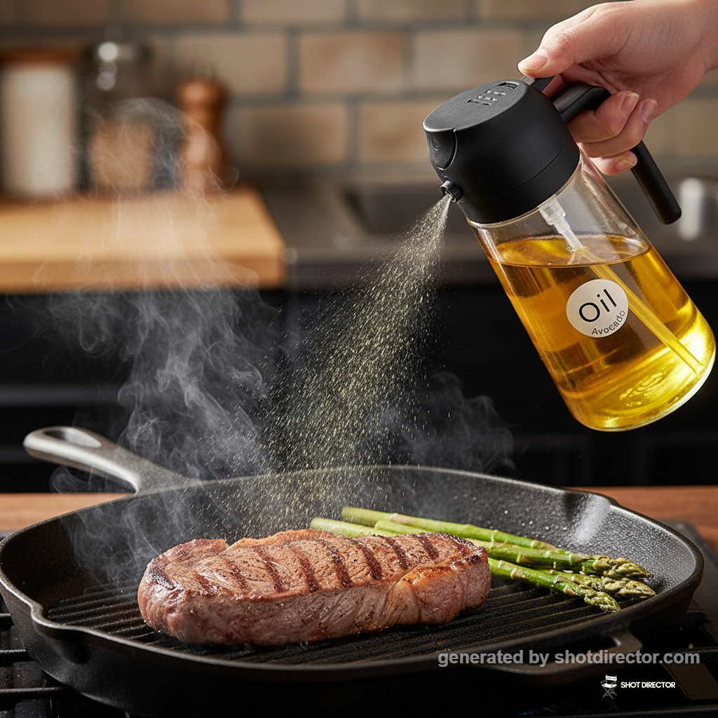 “A dynamic close-up shot of the oil dispenser actively spraying a fine mist of oil onto a sizzling steak and vibrant asparagus spears on a hot cast iron grill, steam rising dramatically under warm, directional lighting, capturing an authentic cooking moment.”