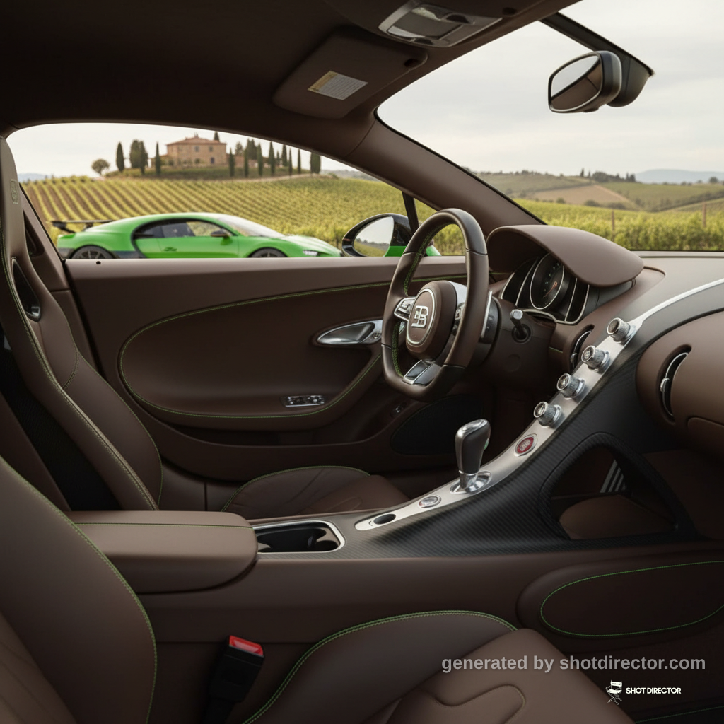 “A detailed interior shot of the Bugatti Chiron, focusing on its luxurious elements, with a glimpse of a Tuscan vineyard through the window, bathed in soft, diffused light.”