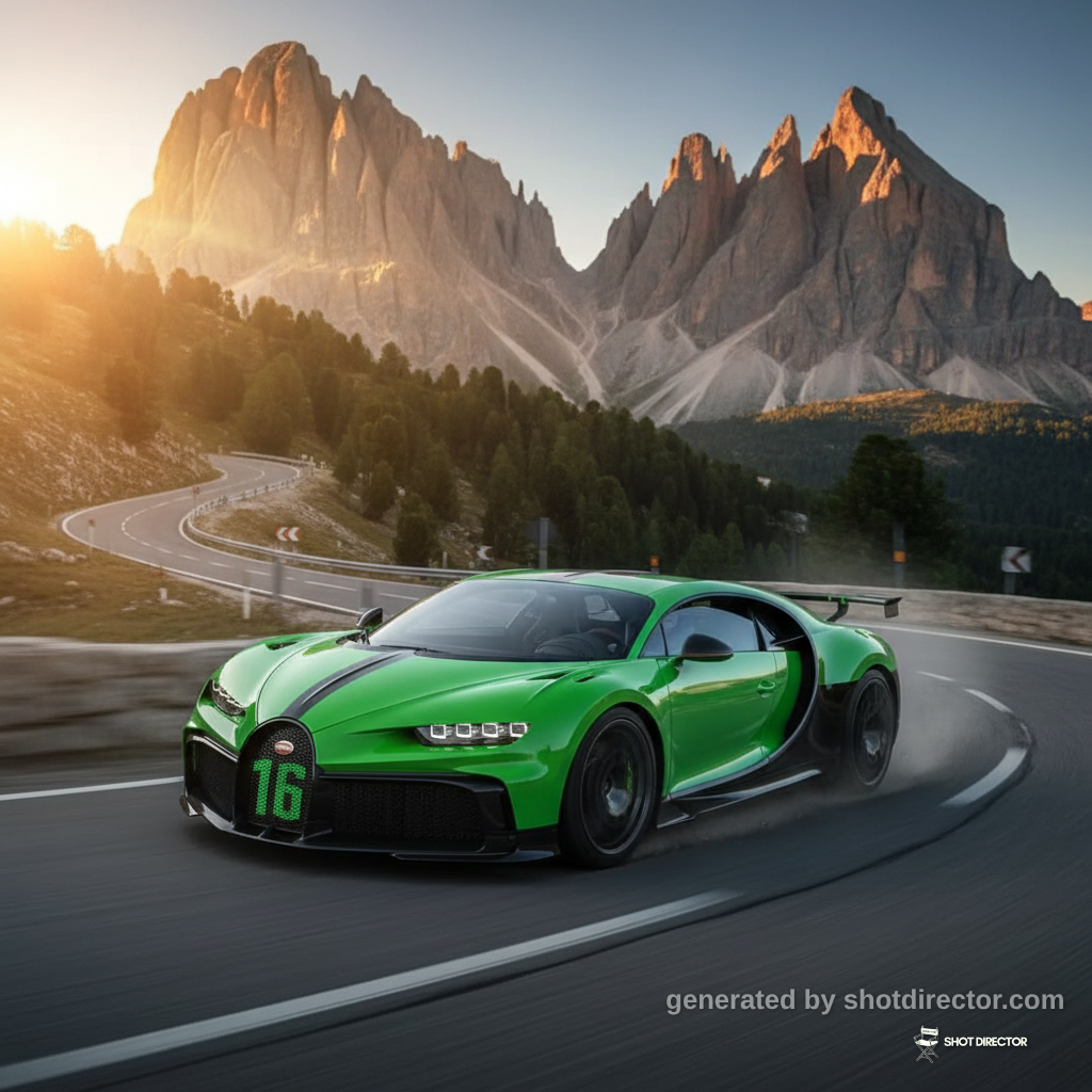 “A low-angle, rear three-quarter shot of the Bugatti Chiron speeding through a winding mountain road in the Italian Dolomites during golden hour, with dramatic peaks in the background and a lens flare.”