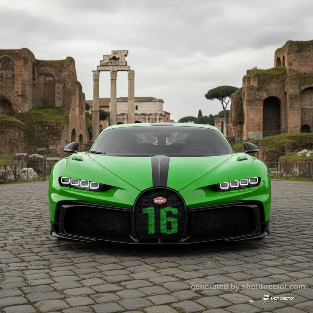 “A frontal close-up shot of the Bugatti Chiron, emphasizing its grille and headlights, parked elegantly in front of ancient Roman ruins under soft, overcast lighting in Italy.”