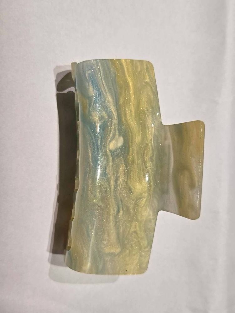 Marbled glitter hair claw clip with a blue, yellow, and white iridescent pattern