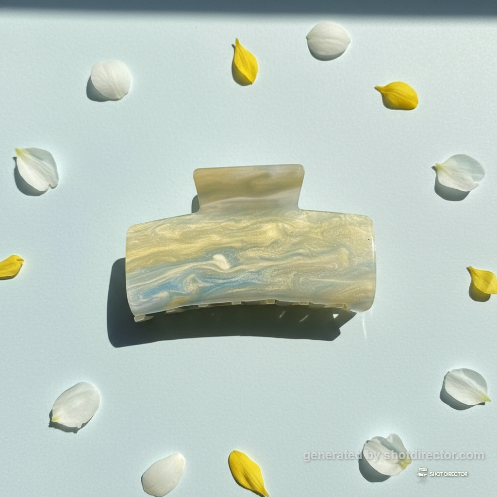 “A bright flat lay of the hair clip nestled among a sprinkle of delicate white and yellow petals on a pale blue surface, illuminated by soft daylight.”