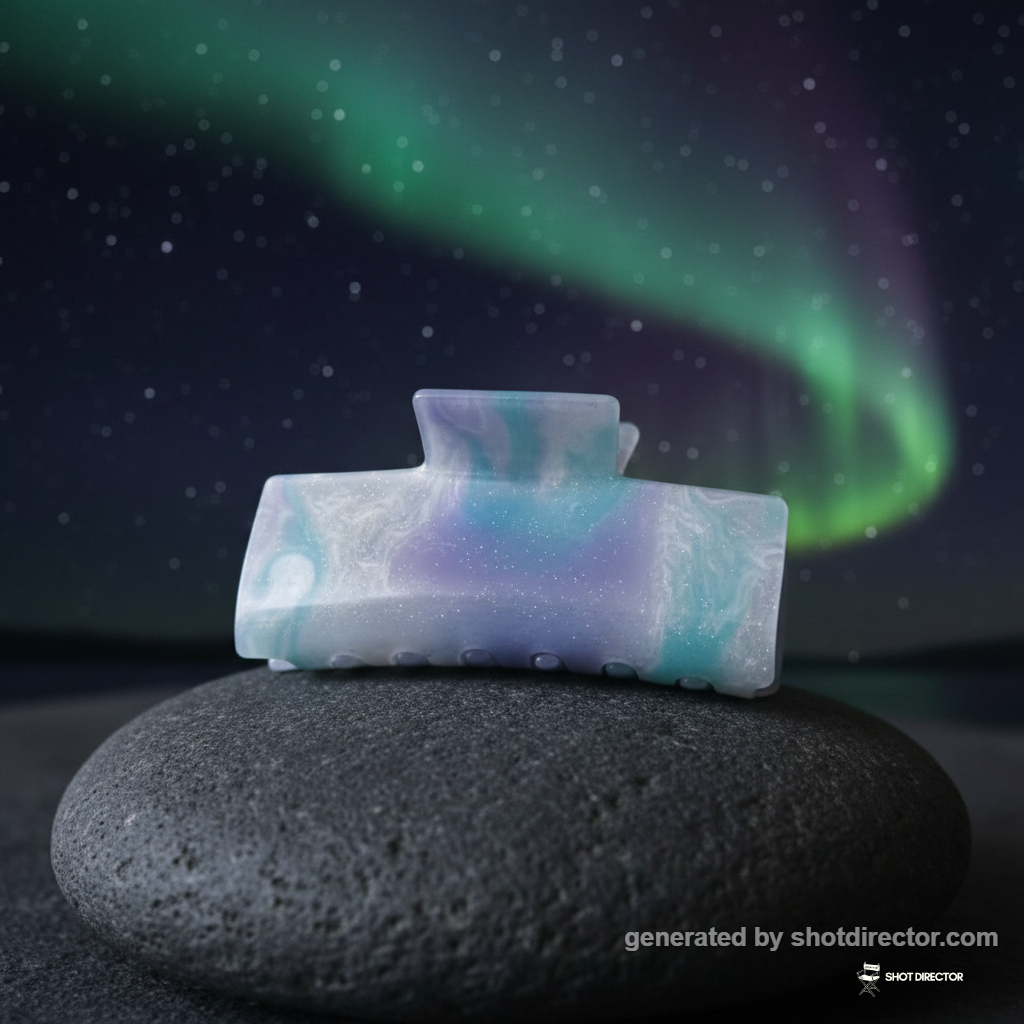 “A close-up of the midnight-colored hair clip placed delicately on a smooth, grey rock at midnight hour, with a blurred soft focus background of a starry midnight sky with some hint of northern light transitioning from the different colors, emphasizing its "sky collection" theme”