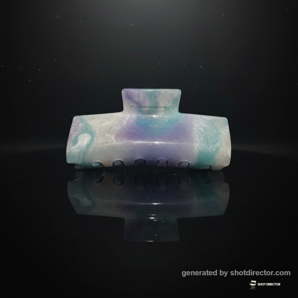 The glitter, swirling pastel colors, and unique resin design of the "Midnight" hair clip will be prominently showcased