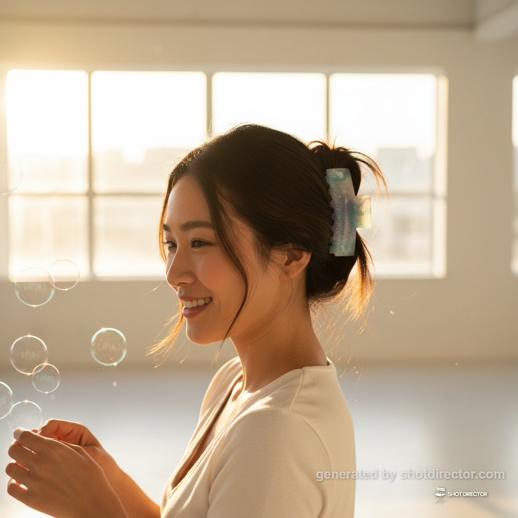 “An approachable shot of an Asian woman (20-30, natural style) wearing the "Midnight" glitter hair clip, playfully interacting with "star" bubbles or light reflections against a sun-drenched, slightly out-of-focus backdrop of an airy, open space, highlighting the clip's joyful essence and secure hold.”