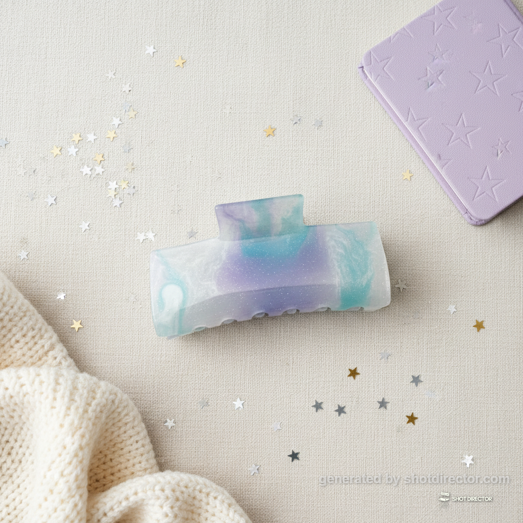 “A charming flat lay featuring the "Midnight" glitter hair clip prominently, surrounded by whimsical elements like miniature star confetti, a small pastel-colored journal, and a cozy knit throw, all on a light, textured surface under bright, even studio lighting.”