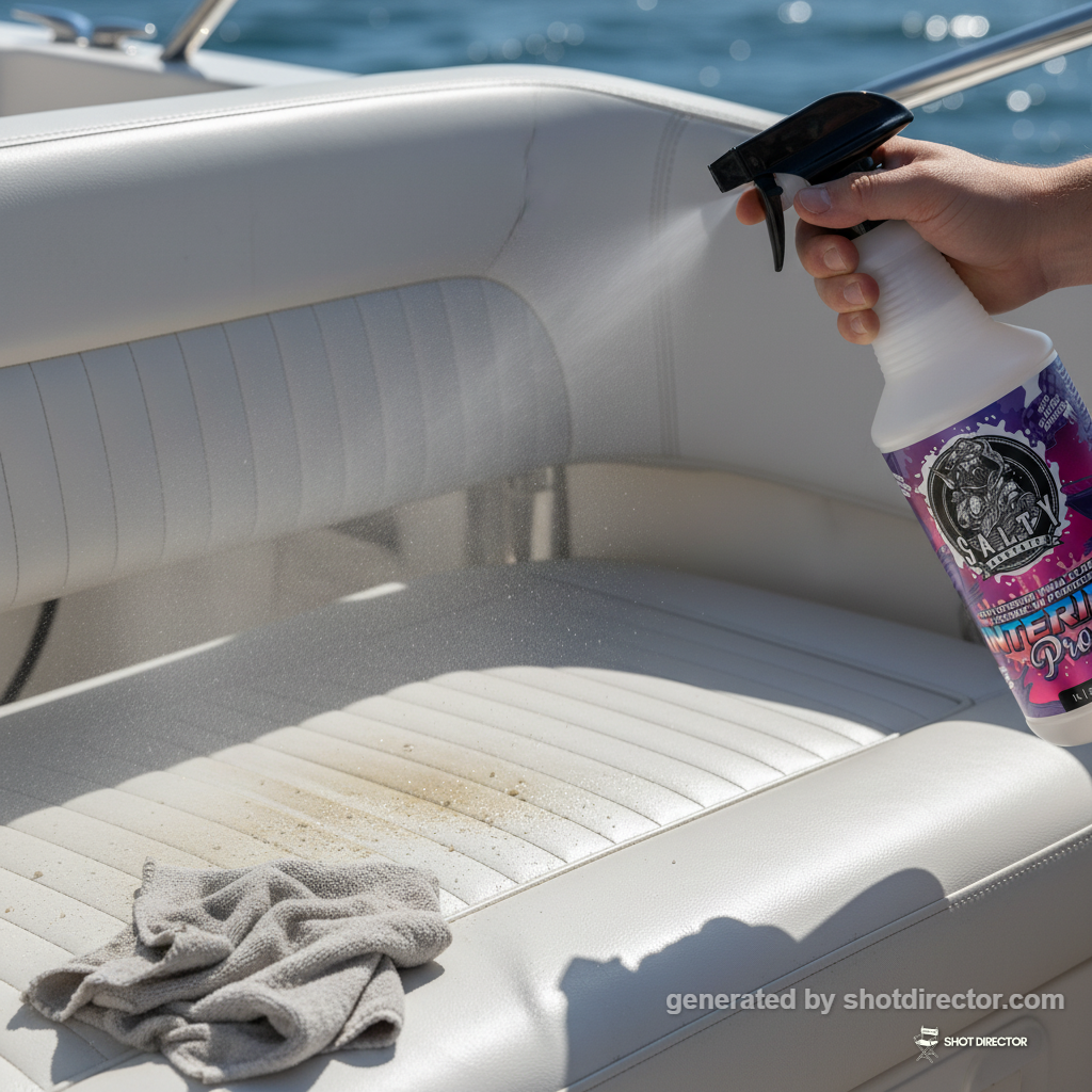 “A dynamic close-up shot of the spray bottle releasing a fine mist onto a boat's vinyl seat, showing immediate cleaning action with focused, bright studio lighting.”