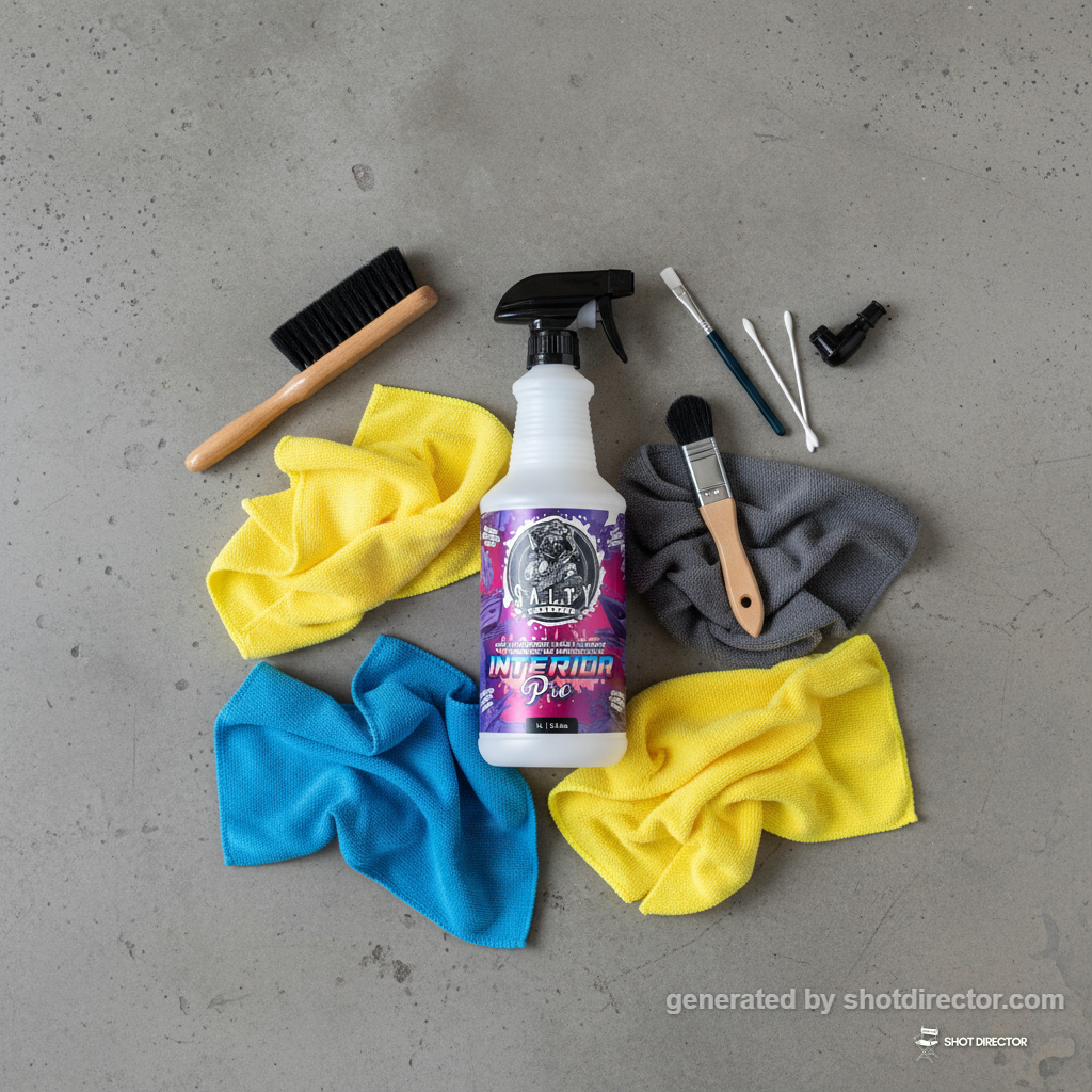 “An overhead flat lay composition featuring the Salty Captain Interior Pro bottle surrounded by high-quality microfiber cloths and detailing brushes, suggesting professional use under bright, even lighting.”