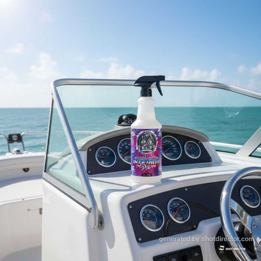 “The Salty Captain Interior Pro bottle is placed on a pristine boat dashboard with the ocean visible through the windshield, illuminated by natural sunlight to highlight its marine application.”