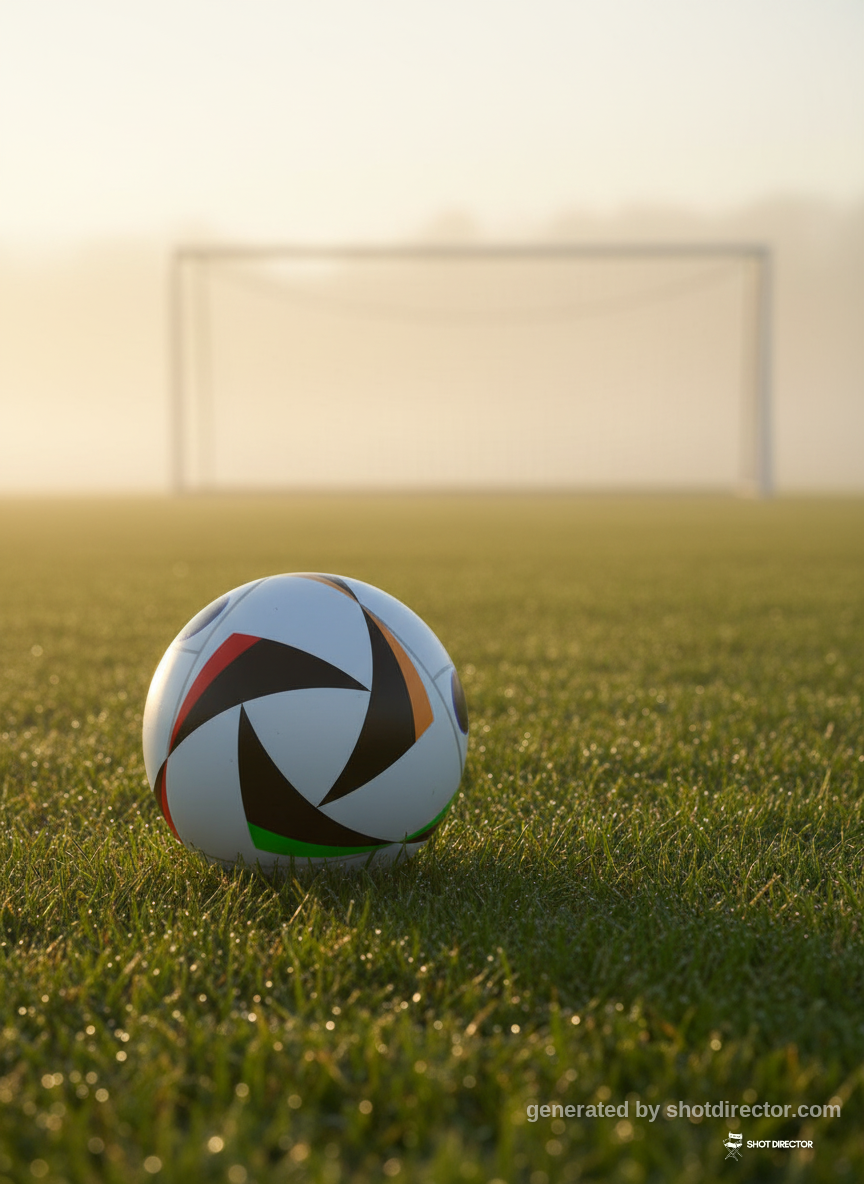 “The stylized soccer ball resting on lush green grass at sunrise, casting long shadows, with a distant, misty soccer goal blurred in the background.”