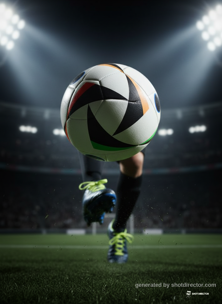 Dramatic stadium lighting will accentuate the ball's texture and dynamic motion, creating high contrast and intensity