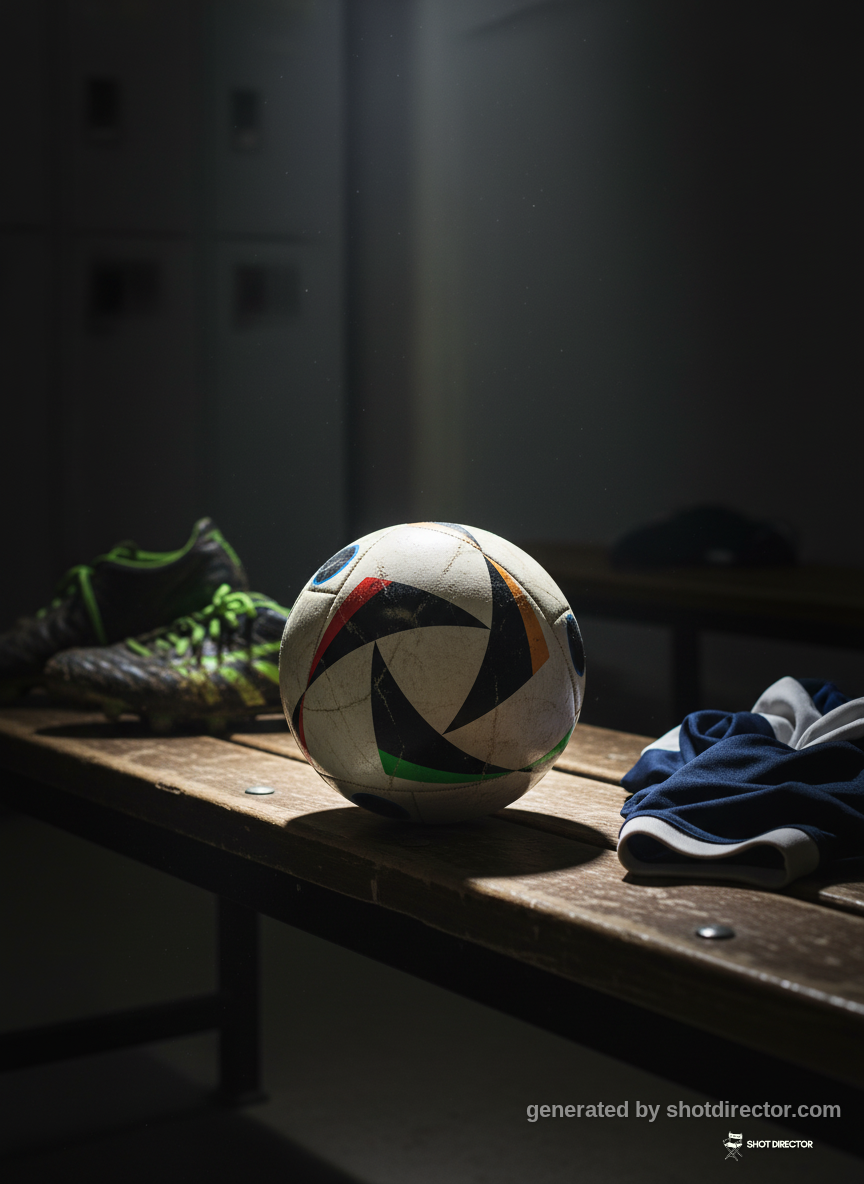 “An atmospheric shot of the ball on a worn locker room bench, surrounded by blurred cleats and a jersey, illuminated by a single overhead light source.”