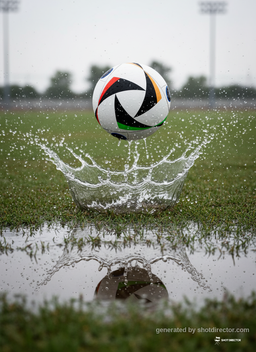 “The ball captured in high-speed photography as it creates a splash in a puddle on a wet field, showcasing dynamic motion and reflective light.”
